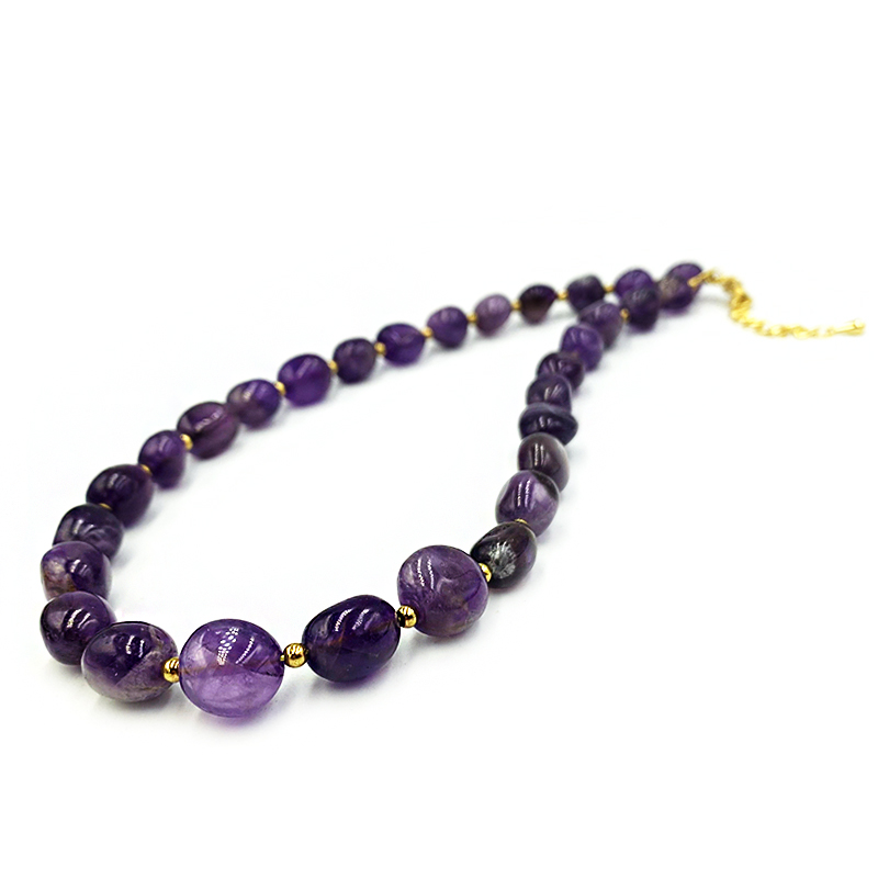 Σύμφωνα με τη μυθολογία μια μέρα ο θεός Διόνυσος μεθυσμένος κατεδίωξε μία κόρη, την Αμέθυστο, που αρνιόταν τον έρωτά του, εκείνη προσευχήθηκε στους άλλους θεούς να παραμείνει αγνή. Η θεά Άρτεμις εισάκουσε την προσευχή και τη μεταμόρφωσε σε λευκή πέτρα. Ταπεινωμένος και μετανιωμένος από την επιθυμία της Αμεθύστου να παραμείνει αγνή, ο Διόνυσος έχυσε κρασί πάνω στην πέτρα αυτή ως προσφορά και από τότε οι κρύσταλλοί της είναι βαμμένοι σε βιολετί χρώμα.